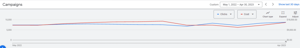 Now, comparing those numbers to the actual data compiled over the last 12 full months, there appears to be a large discrepancy. It’s hard to get a straight answer on whether SpyFu and Semrush factor in Microsoft ads (I found conflicting information on both SpyFu and Semrush’s websites – it appears they do for SEO, but PPC is much murkier). So, in the spirit of fairness, let’s look at the monthly averages that our anonymous account spent on Google Ads Search ads alone. In Google Ads, we averaged about 7,500 clicks a month from Search ads (non-shopping, non-display, etc) with an average monthly budget of $13,800. So, even when we are looking at only Google Ads Search data, SpyFu and Semrush estimations were both off by more than two times.