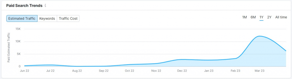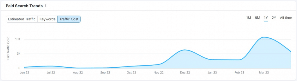 The PPC competitive spy tool, Semrush, is very confusing. We can’t get a definition of what “Estimated Traffic” is. Is it possible impressions that the account could have gotten, or is it the estimated clicks that the account could have received? We can’t find a definition for it on the Semrush website, and not even ChatGPT could answer the question! If we think Estimated Traffic is clicks, Semrush estimates our anonymous account averages about 4,700 clicks a month, with an average monthly budget of $5,000. You can see this illustrated in the two tables below: