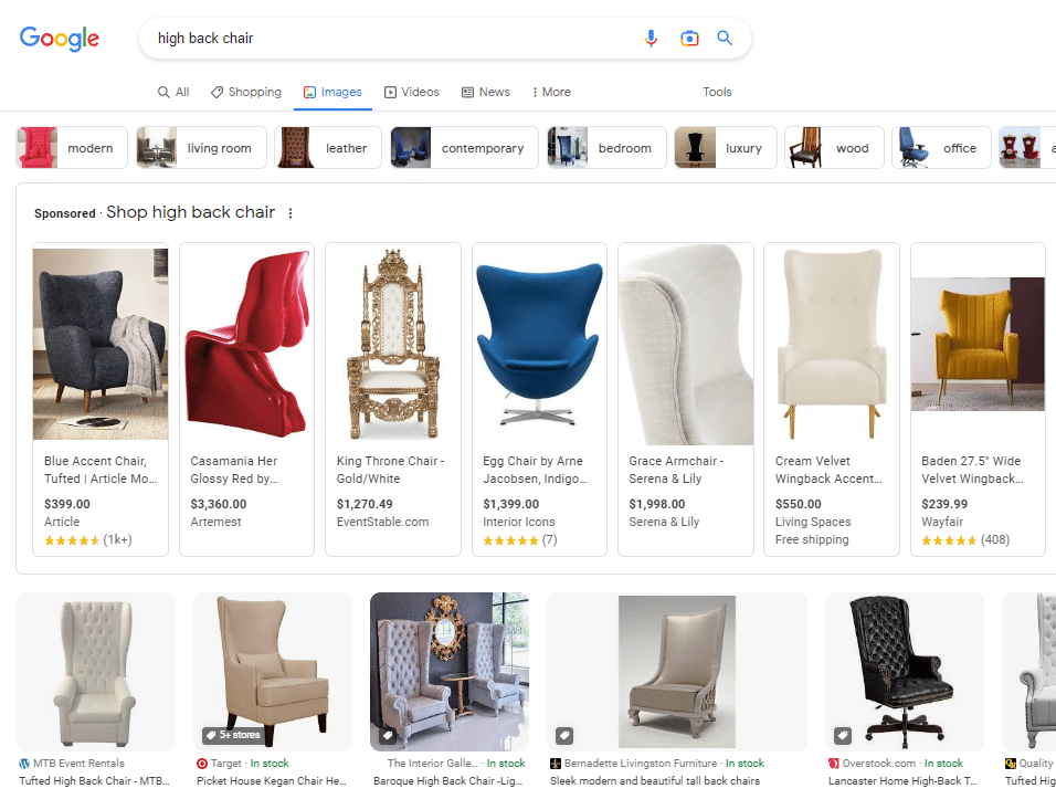 - Google Images: Google images is an under-rated tab on Google, where you can hone in on images. Free product listings can show there, usually as a carousel, and include a Product tab, as well as the price and where it can be purchased.