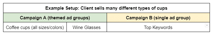 Broad match with Smart Bidding isn’t a new concept, but it is getting much better as technology advances. In my opinion, there is no right or wrong way to set up your broad match campaign. At JumpFly, we have tested themed ad group campaigns and single ad groups campaigns; see my examples below: