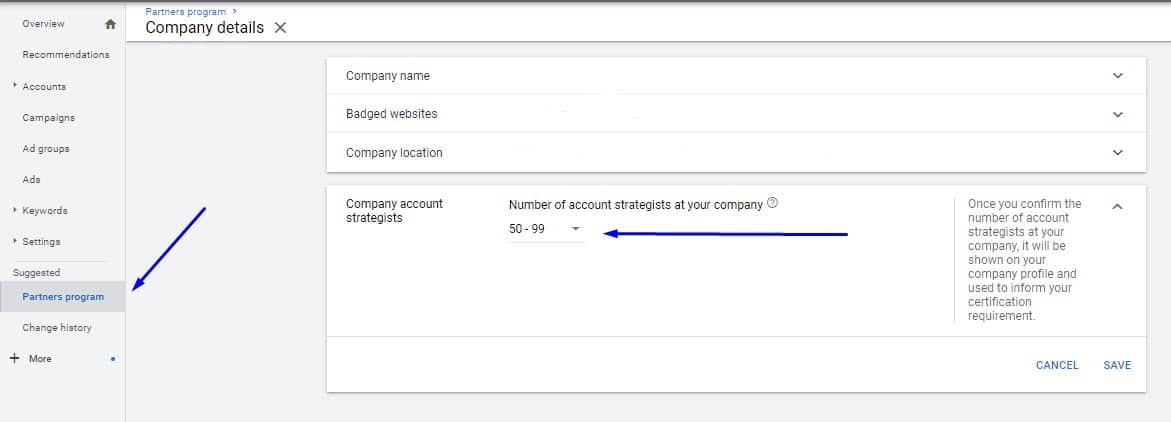 Fortunately, Google listened to its Partner feedback on the account strategist counting methods and made some well-received updates. Companies can now set the number of account strategists on the Company Details page of their Google Ads manager account: