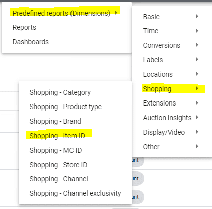 Under the REPORTS tab in Google Ads, you will find a Predefined reports (Dimension) selection. Then, from there you will see a Shopping selection. Once you click on Shopping, you’ll want to select Shopping – Item ID report.