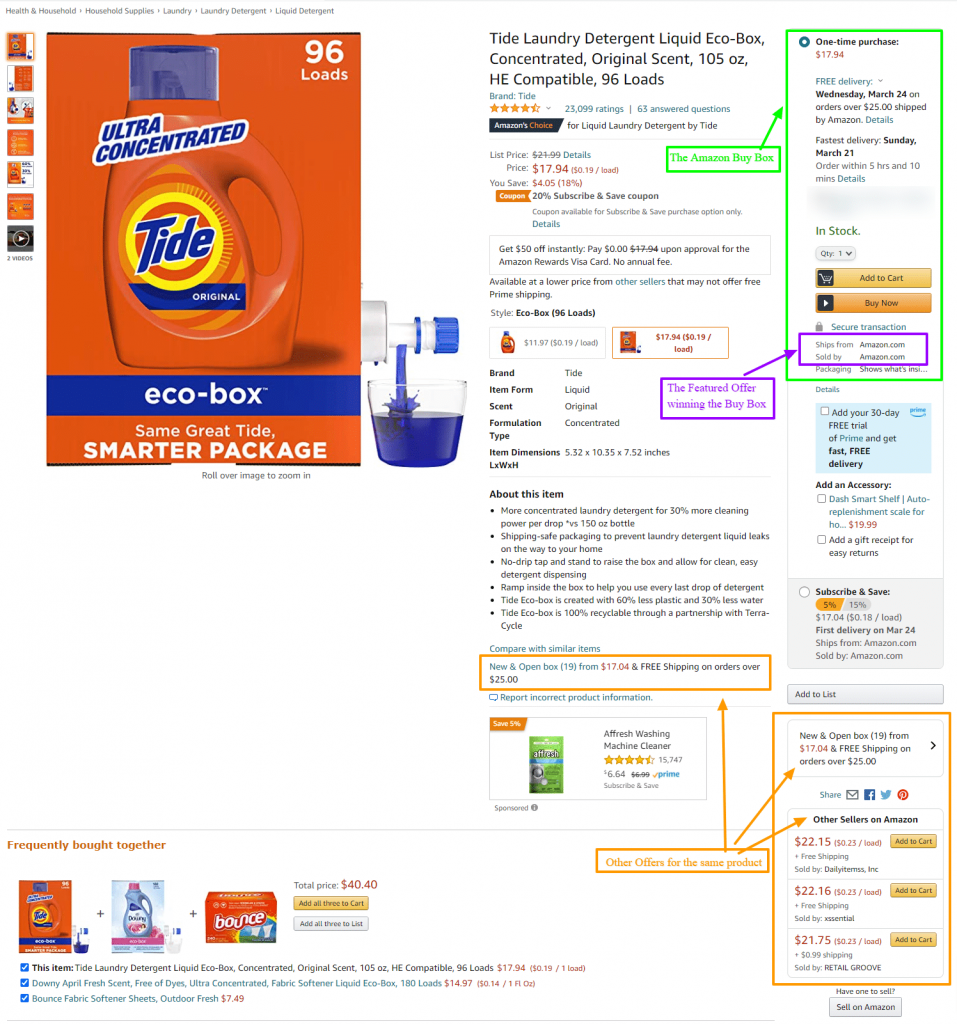 1. Price Competitiveness: Amazon wants to offer its shoppers the lowest possible price for any given product on its site. And that price competitiveness does not stop at the many offers that can exist for a single product (See the Tide example with 19 other offers on Amazon!) and includes other e-commerce sites. To be competitive and qualify for Buy Box Eligibility, you must offer the lowest price among the other Amazon sellers and across the e-commerce world. Amazon’s algorithms scrub other ecommerce sites like Walmart, Home Depot, Costco, and Kohls, to name a few.