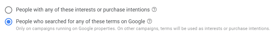 NOTE: You can additionally expand your audience by adding URLs or Apps that your ideal customer might visit. I typically steer clear of that. While it does expand your audience size, I view it as also watering down the effectiveness of your included search terms because your audience becomes less targeted.