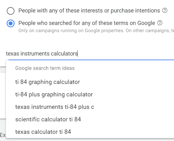 The neat part is from there, Google will suggest related search terms based on your initial input. I put in “texas instruments calculators,” and Google then spits out 30+ related search terms they know to have volume. Another common option is to add converting search terms from your Search network campaigns.