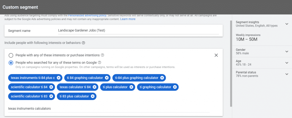 Either way, the goal of Custom Segments is to use search terms and phrases to reach people who are likely to be interested in your products or services. Those people have revealed the intention to convert based on their recent behavior and activities online, which is why they are so effective. You are able to reach a collection of people who have indicated an interest in the product or service you sell, have likely never interacted with your website before, and the audience is typically very large.