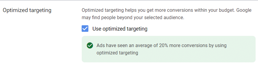 A recently added option to look out for is the option to add “Optimized Targeting.” Google will check this box automatically and tell you it will lead to 20% more conversions if you opt in. This is something I am unchecking at the moment, but I intend to test opting in for high-performing clients.