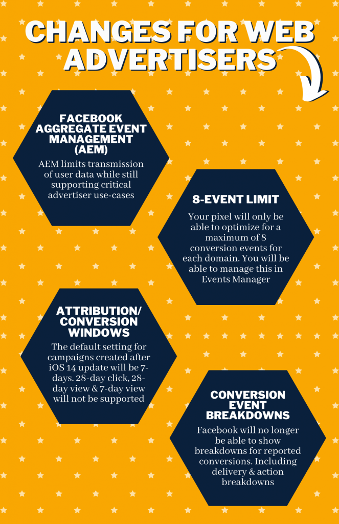 - For advertisers utilizing web-based business tools, Facebook will limit the measurement of some events for iOS 14 users through the new data-sharing protocol. This new AEM system will change the way that advertisers track conversions; to learn more read Apple’s blog post.