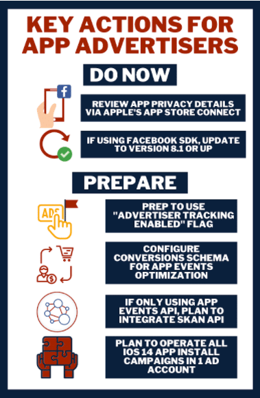 Now that we’ve summarized the changes, let’s go over what you can do now to prepare. In summary, you’ll need to make sure to review Apple’s new privacy details and if you’re using Facebook SDK, make sure you update to version 8.1 or up. Looking ahead, you’ll also want to prepare to use an “advertiser tracking enabled” flag, configure your conversions schema for app events, plan to integrate with SKAN API, and plan to consolidate your app campaigns to one ad per account.