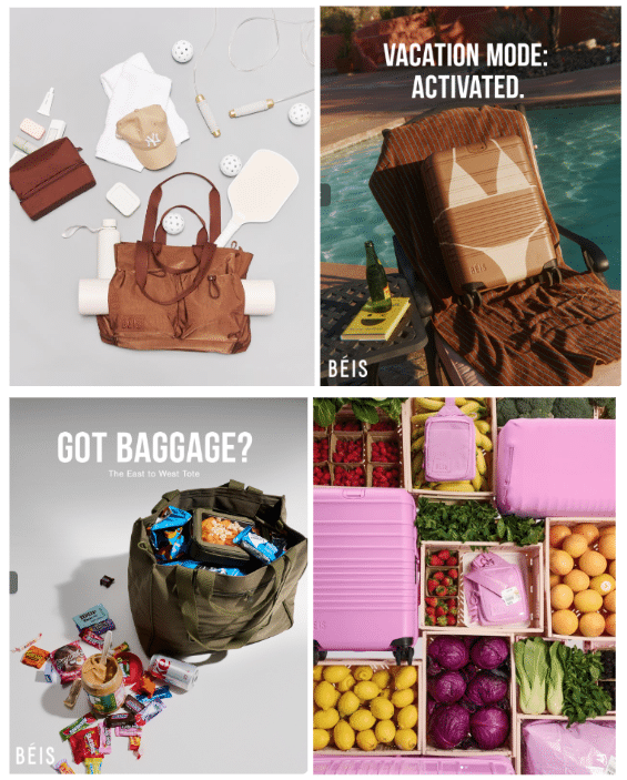 Another noteworthy concept is the way her product line naturally evolved as her life did. Beis expanded from luggage to work essentials, and then to a family collection filled with a variety of accessories designed with parents in mind as she entered that new chapter of her life. Taking the static image ad for example, Beis leaned into Mitchell’s new lifestyle since it continued to spark conversations around functionally stylish pieces while also allowing the brand’s voice to strengthen and gain new community members through witty, enticing, and relatable content.