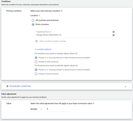 6. You can also add a secondary condition; if you chose Location as your primary, you could choose Device or Audience as your secondary.