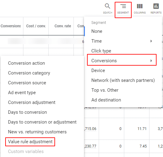 Once the new Conversion Value Rule has been running for a while, you can segment the data to see how it’s doing. To do so, on the Campaigns tab, click the Segment Icon, and select Conversions, then Value Rule Adjustments.